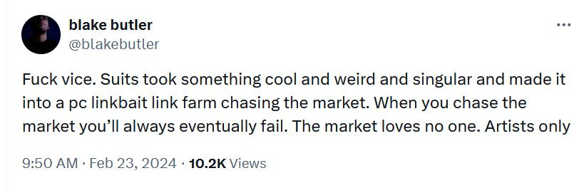 feel good about vice ending, like fuck them. i agree with blake’s tweet about it.